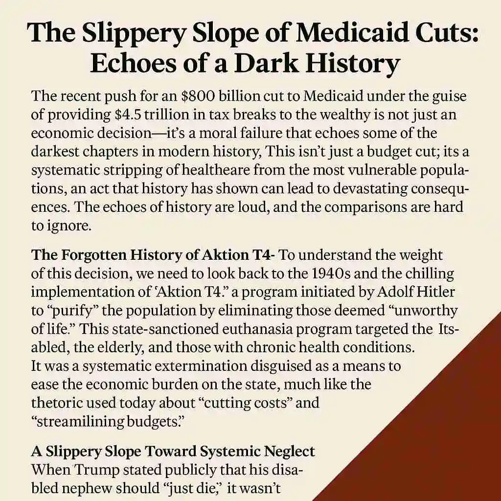 The recent push for over $800 billion in Medicaid cuts under the guise of providing $4.5 trillion in tax breaks to the wealthy is not just an economic decision, it’s a moral failure that echoes some of the darkest chapters in modern history. This isn’t just a budget cut; it’s a systematic stripping of healthcare from the most vulnerable populations, an act that history has shown can lead to dev